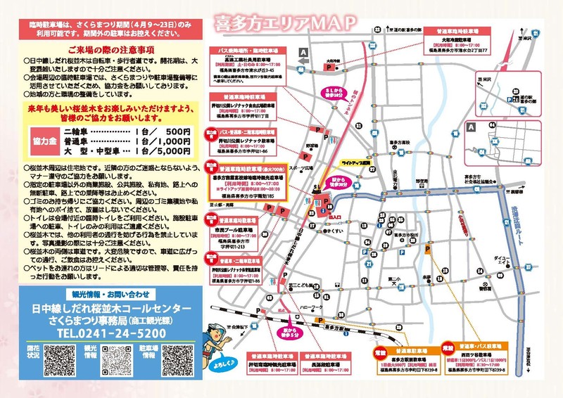 🌸喜多方さくらまつり🌸 今年も喜多方さくらまつりを4月9日(木)~4月23日(木)で開催します。 ※市内桜並木周辺の道路は大変混雑いたします。駐車場等をご確認のうえご来場ください。駐車場については下記リンク先の市HPにてご確認いただけます。⇒こちら