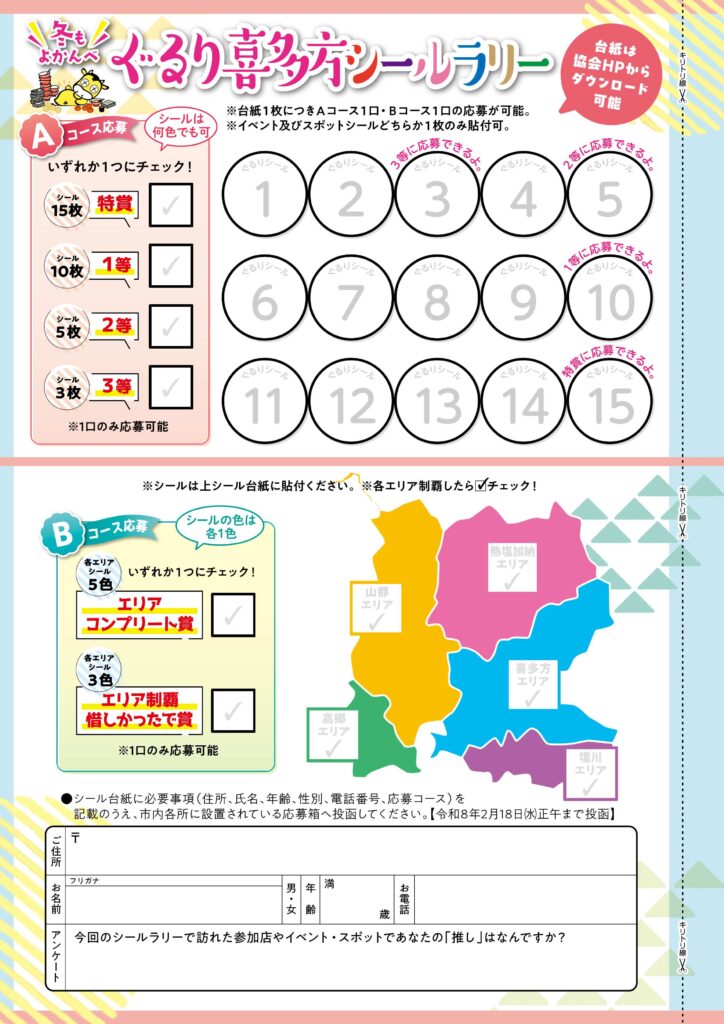 ❄️ぐるり喜多方シールラリー応募台紙❄️ 毎年ご好評をいただいている “冬もよかんべ” ぐるり喜多方シールラリーを今年も開催!開催期間中、市内対象店のご利用やイベントやスポットを訪れるともらえるシールを集めて応募すると、ふくしま会津牛や、喜多方の特産品の詰め合わせ、商品券などの超豪華賞品が抽選で70名様に当たります✨おひとり様何口でもご応募いただけますが、パンフレットには限りがありますので、応募台紙はこちらからダウンロードしてご利用ください。 たくさんのご応募をお待ちしております!