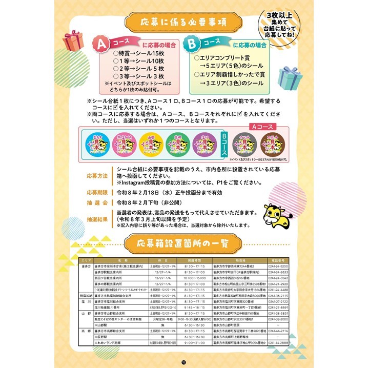 開催期間中、市内対象店のご利用やイベントやスポットを訪れるともらえるシールを集めて応募すると、ふくしま会津牛や、喜多方の特産品の詰め合わせ、商品券などの超豪華賞品が抽選で70名様に当たります✨おひとり様何口でもご応募いただけます☺️