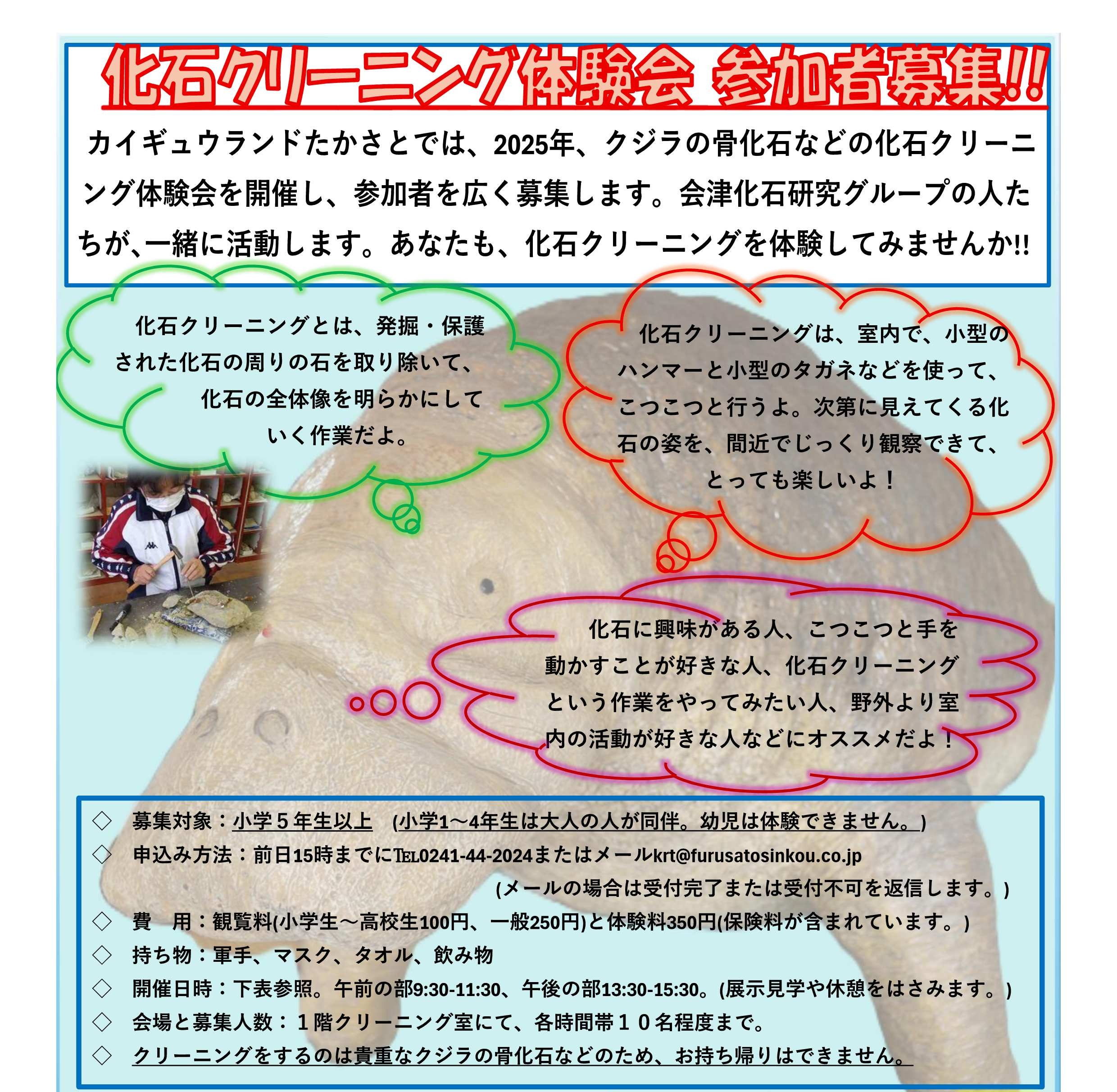 カイギュウランドたかさとでは、クジラの骨化石などの化石クリーニング体験会を開催します!当日は、会津化石研究グループが一緒に活動します。