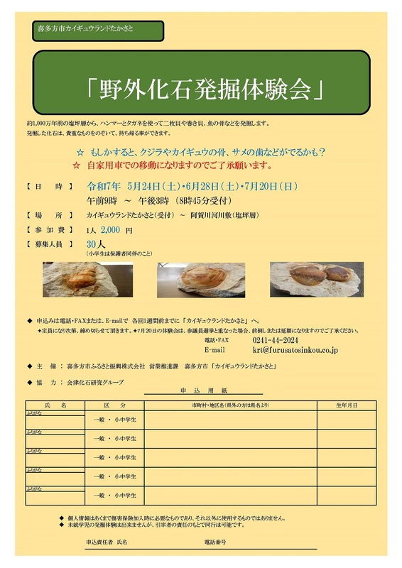 | 開催場所 | カイギュウランドたかさと(受付) ~ 阿賀川河川敷(塩坪層) |