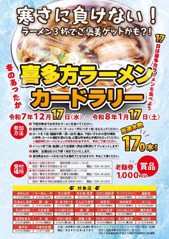| お問い合わせ先 | 会津喜多方商工会議所内 喜多方ラーメンブランドプロジェクト(RBP) 担当:佐藤 |